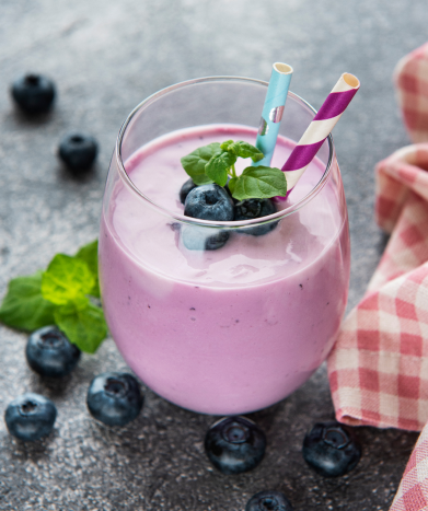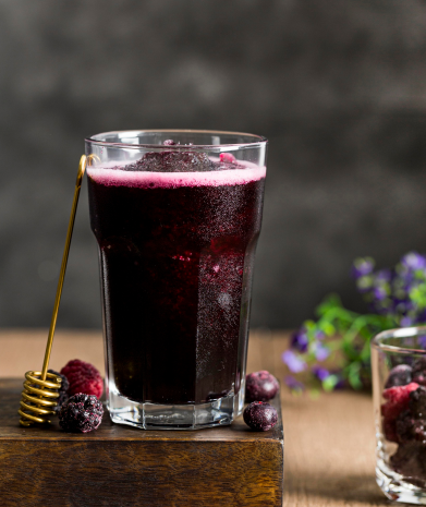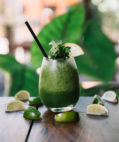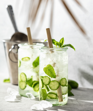 Смешайте в блендере коллаген, огурец, мятные листья, лимонный сок, агаву,